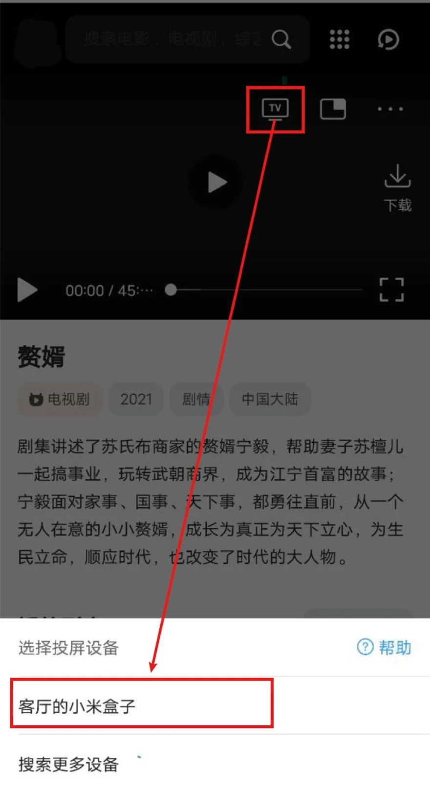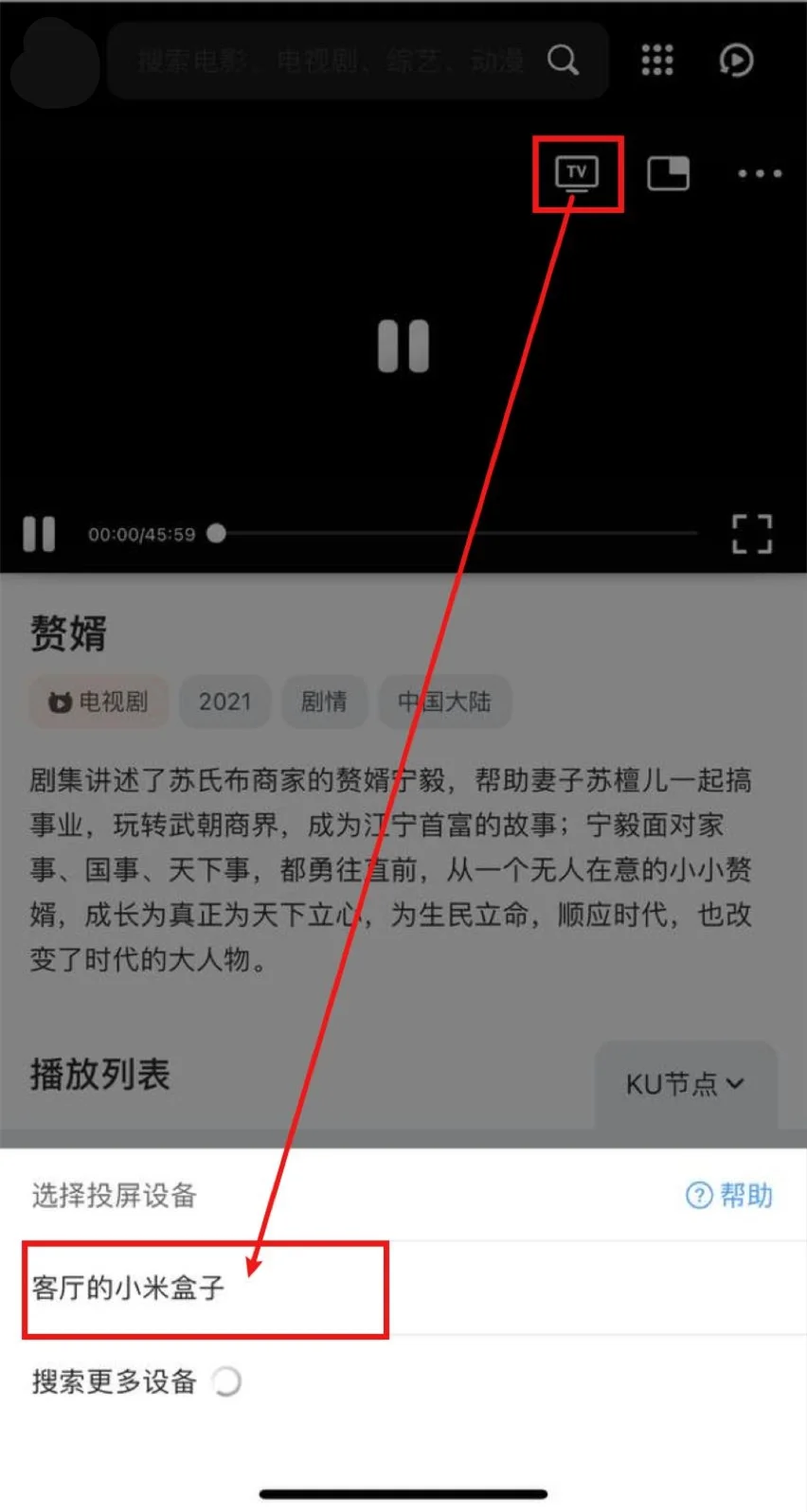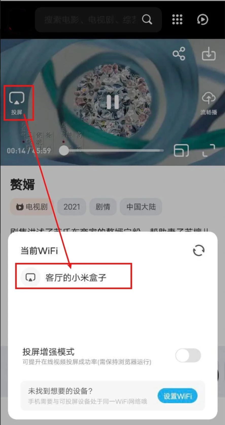 打开QQ浏览器(会接管网页播放器)->打开180小驿站影视->播放视频->选中投屏图标->等待搜寻出智能电视/电视盒子->选中,即可投屏。